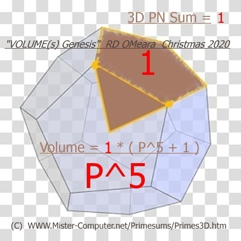 - Sum times fifth power of Golden Ratio [ P^5 ] forms a geometrically precise Dodecahedron volume